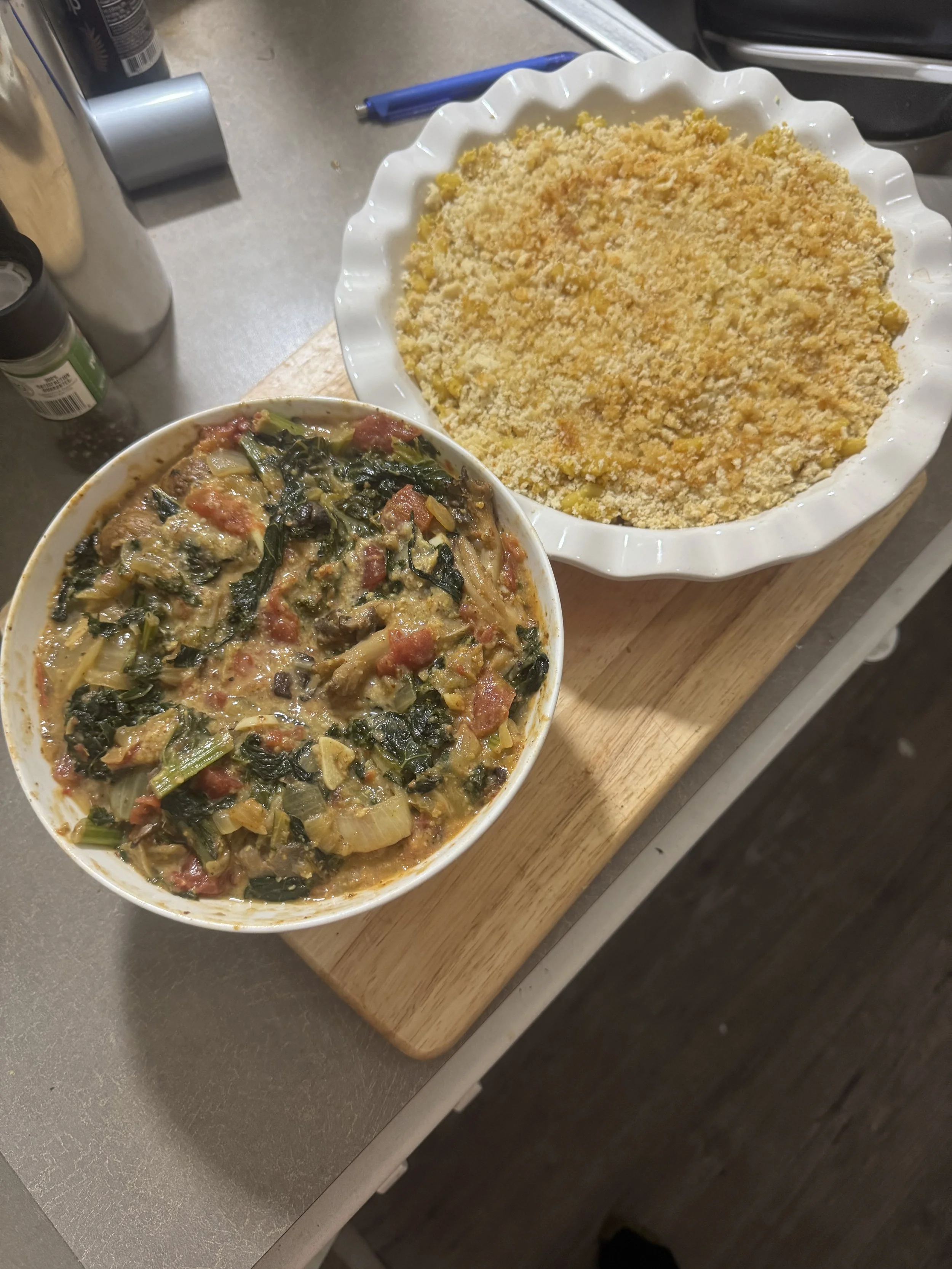 Fortuitously, I had decided to make three dishes for Thanksgiving this year. So, also in play in the kitchen during this disaster: 1) Best Vegan Mac & Cheese (cashews, nutritional yeast, garlic powder, salt, water and lemon juice) topped with panko bread crumbs, spray-on olive oil, and vegan butter; and 2) Creamy Vegan Greens.