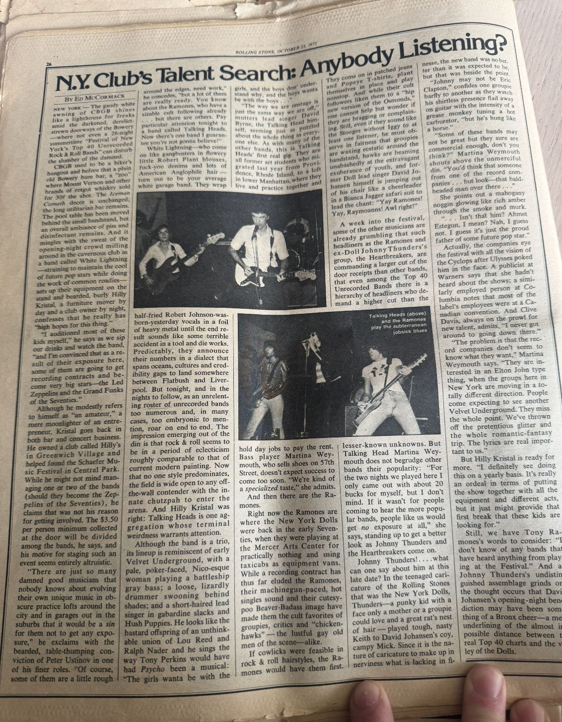 The Voice’s compatriot in the counterculture press, Rolling Stone, 10/23/75. Their famous Patty Hearst cover story. The issue also included a full-page, well ahead-of-the-curve dispatch from the burgeoning weirdo rock scene at CBGB.